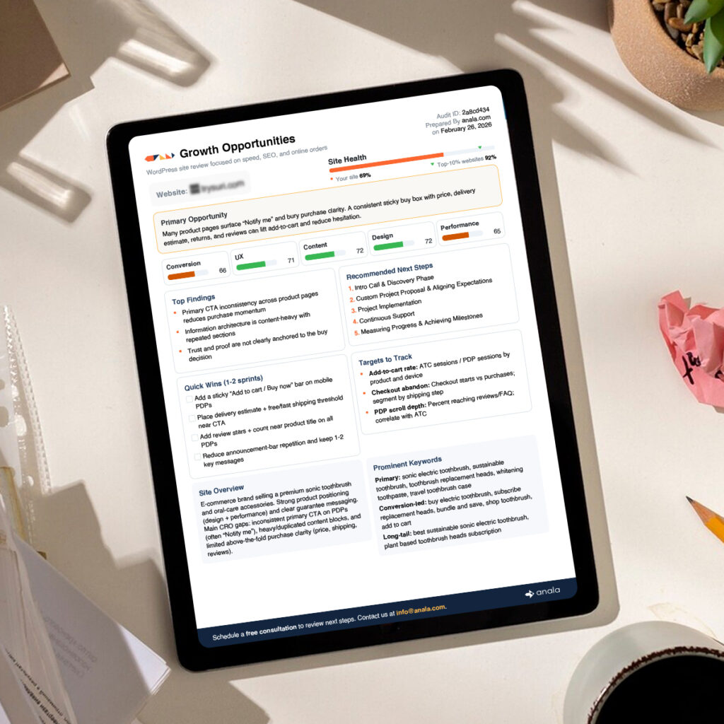 Our Free Growth Audit delivers a custom report built around your site’s biggest opportunities, including UX friction, performance gaps, SEO issues, conversion blockers, and AI opportunities where relevant.